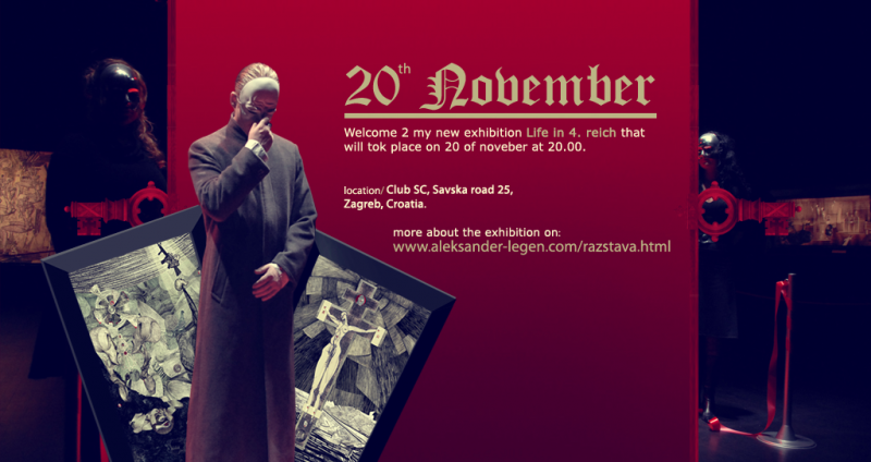 Project Living in 4th Reich is a philosophical visual interpretation of a World where history represents a constantly repeating life cycle of different cultures and nations combined in 13 Art collages. The colages are made from erlier works and studies and are combined in 12 paintings. The 13th painting is a glass painting … They represent a mixture of science, history, mythology, politics, religion and human symbolism . Different works and sketches from different periods of life joind by a strong thought by Polish writer and philospher George Santayana: “Those who do not remember the past are condemned to repeat it.” The project is designed in a space composition to symbolize a drama triangle-pyramid. the paintings are exhibit from the smallest in the begining to the highest towards the middle to the top of the pyramid. The glass painting represents the Sun which is in many cultures portrayted as a deity but in the case of the project it represents a human Child – symbolically “pure” and transparent being. It symbolizes a hope for the future, because each time a child is born a new hope is born for a brighter future.